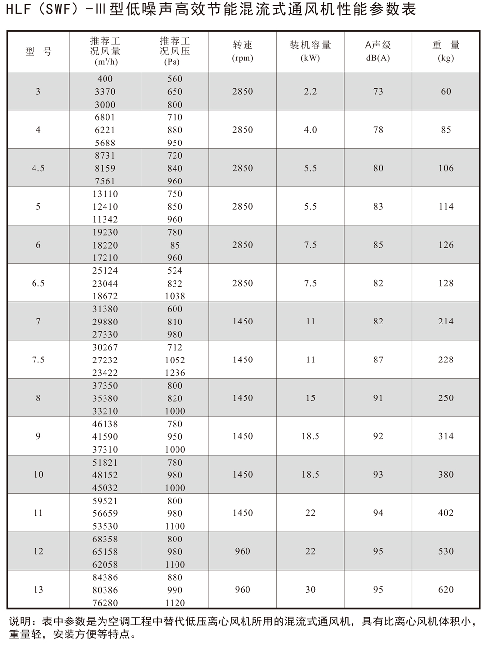 特 點:效率高、噪聲低、結構簡單、運行可靠,(可生產單速、雙速中壓型三種型號及特殊用途的混流風機,包括屋頂式、防爆式、防腐式) 用 途:工礦企業(yè)和高層民用建筑的送排風。 規(guī) 格:φ400~1300mm, 風量: 3000~96000m3/h;風壓: 140~ 1200Pa。